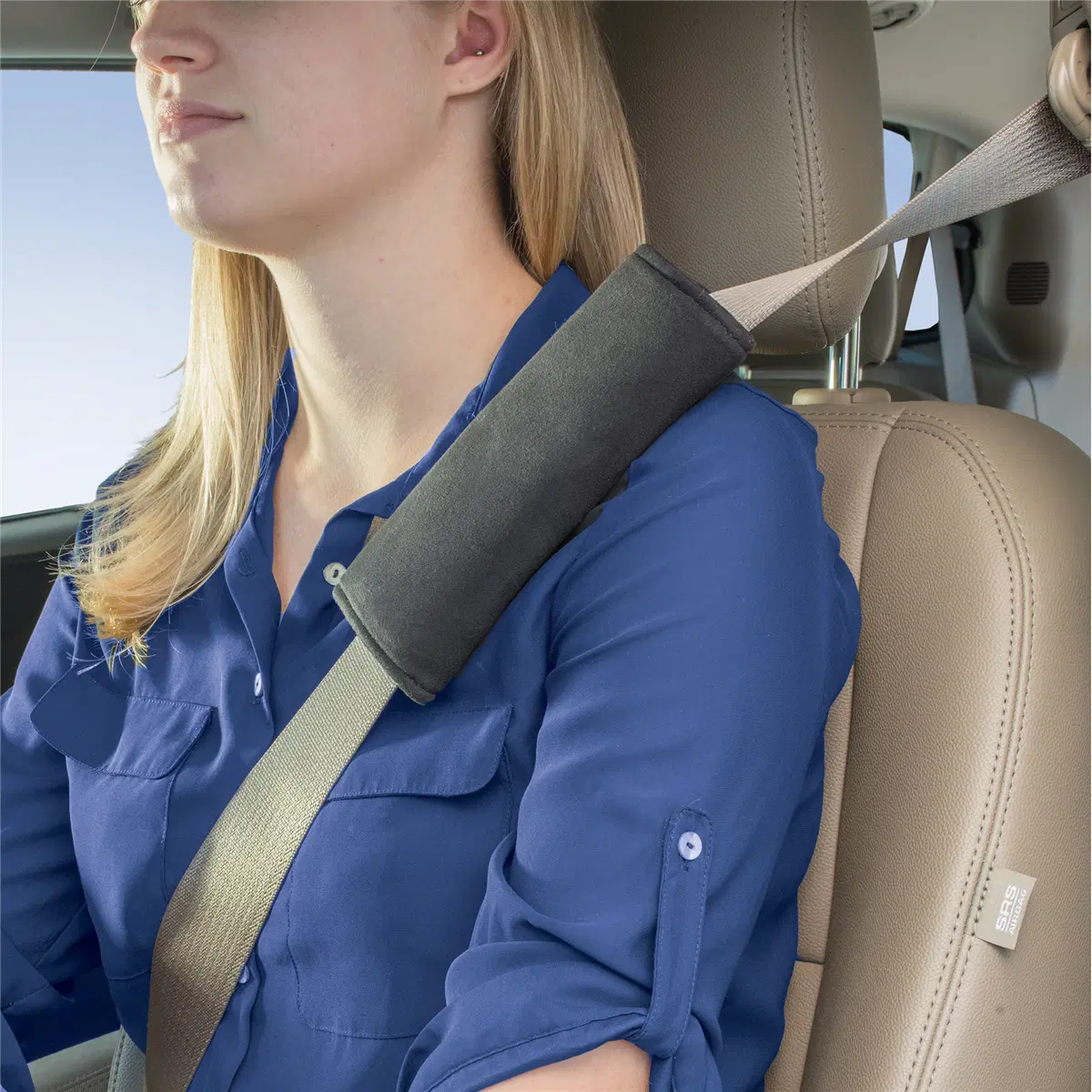 - Attaches around seat belt with hook and loop closure