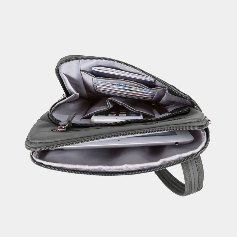 - THIS CROSSBODY BAG HAS A SLEEK, STREAMLINED SHAPE that is perfect for smart-casual, modern, dressing with a minimal silhouette. The main locking zippered compartment is large enough to hold an iPad and has a zippered wall pocket. The front organizer compartment has a drop pocket, 5 RFID protected card slots, a RFID protected Passport pocket, a tethered key clip with LED light plus it has a locking zipper for added security. A front zippered pocket is perfect for a smartphone or other quick-grab