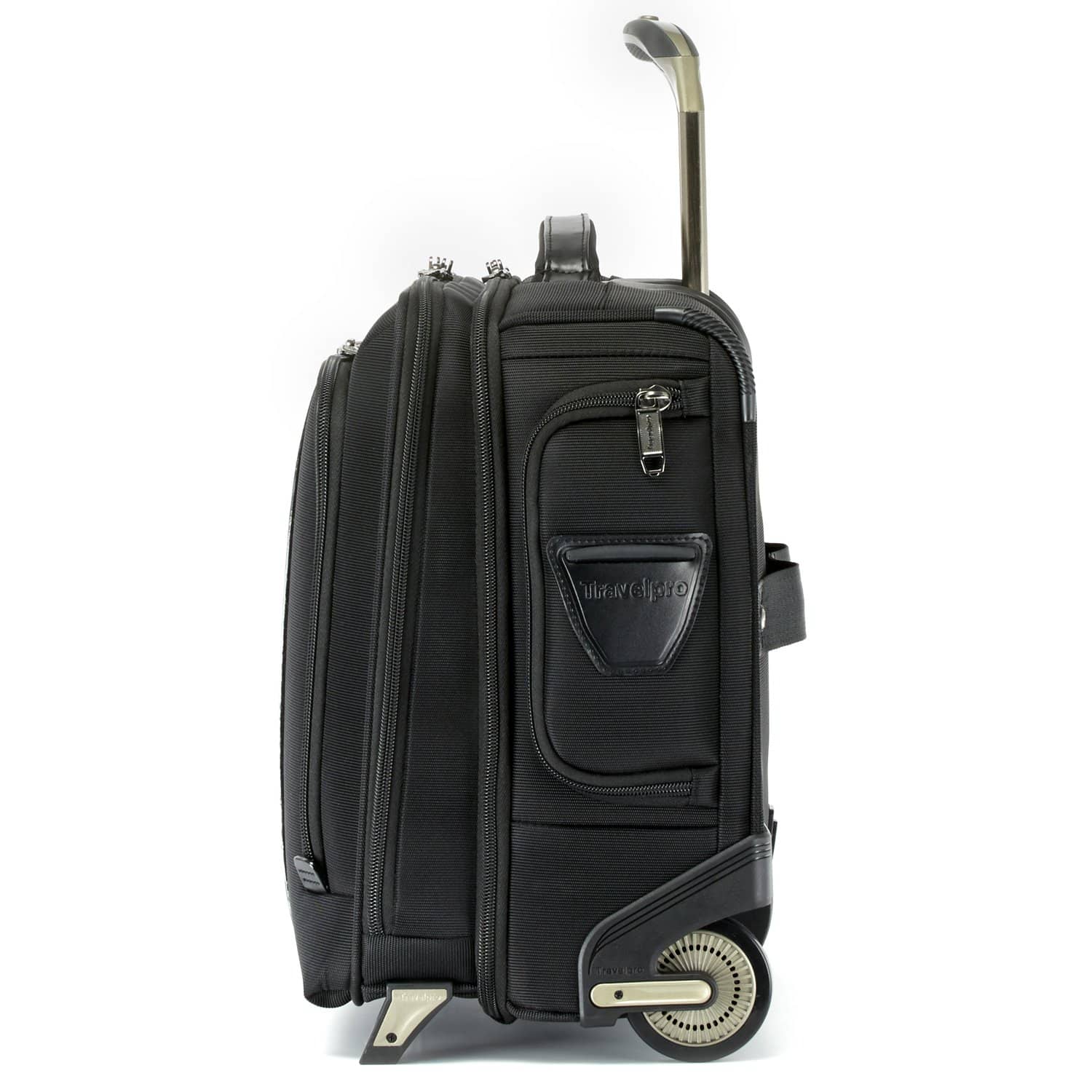 Two durable, high-performance sealed ball-bearing wheels give you easy mobility, or use the rear stacking strap to secure the bag on any Travelpro® rolling luggage for hands-free carrying. High-quality ballistic nylon fabric with DuraGuard® coating resists stains and abrasions, and premium leather accents add polish and professionalism. Backed by the Travelpro® Built For A Lifetime Limited Warranty with our Trusted Companion Promise.