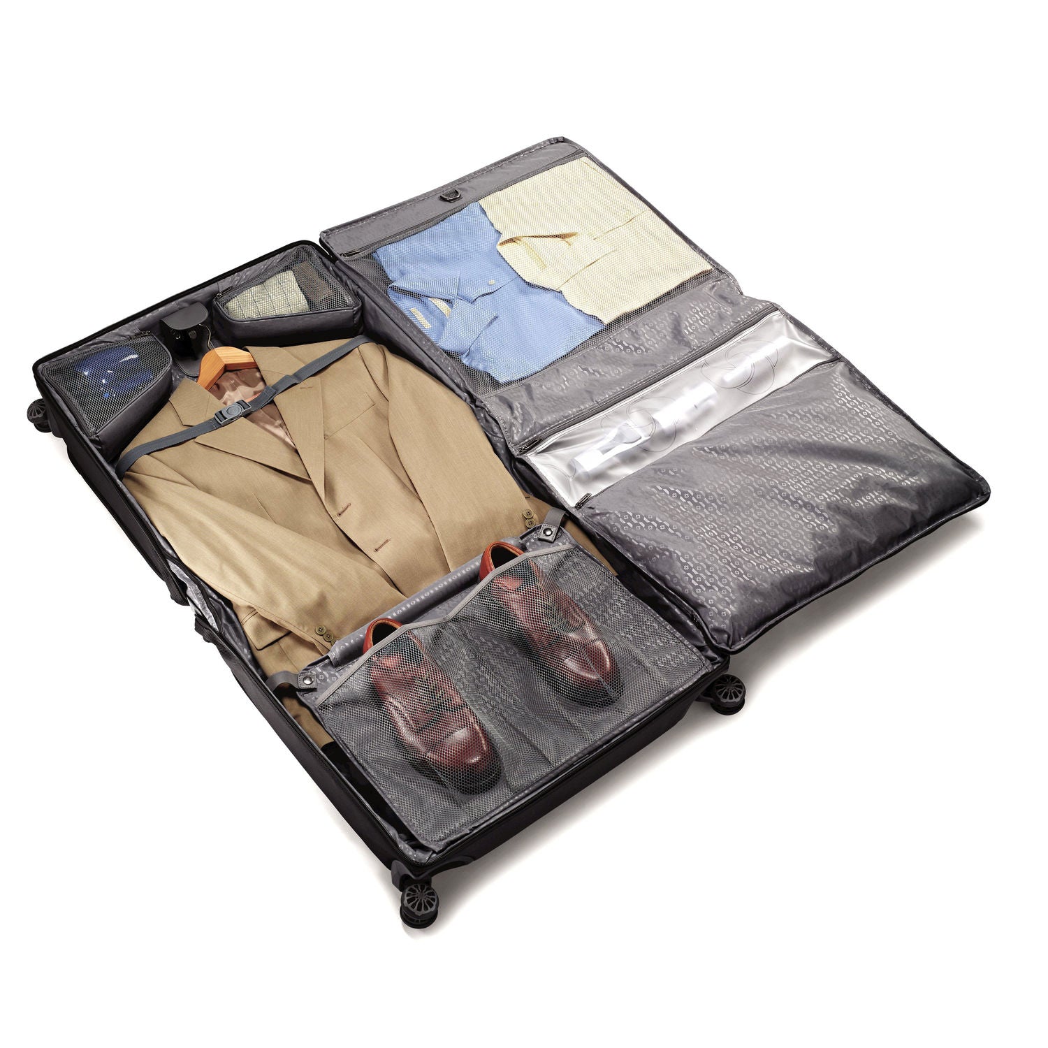 - Compression straps keep clothing neatly packed while traveling