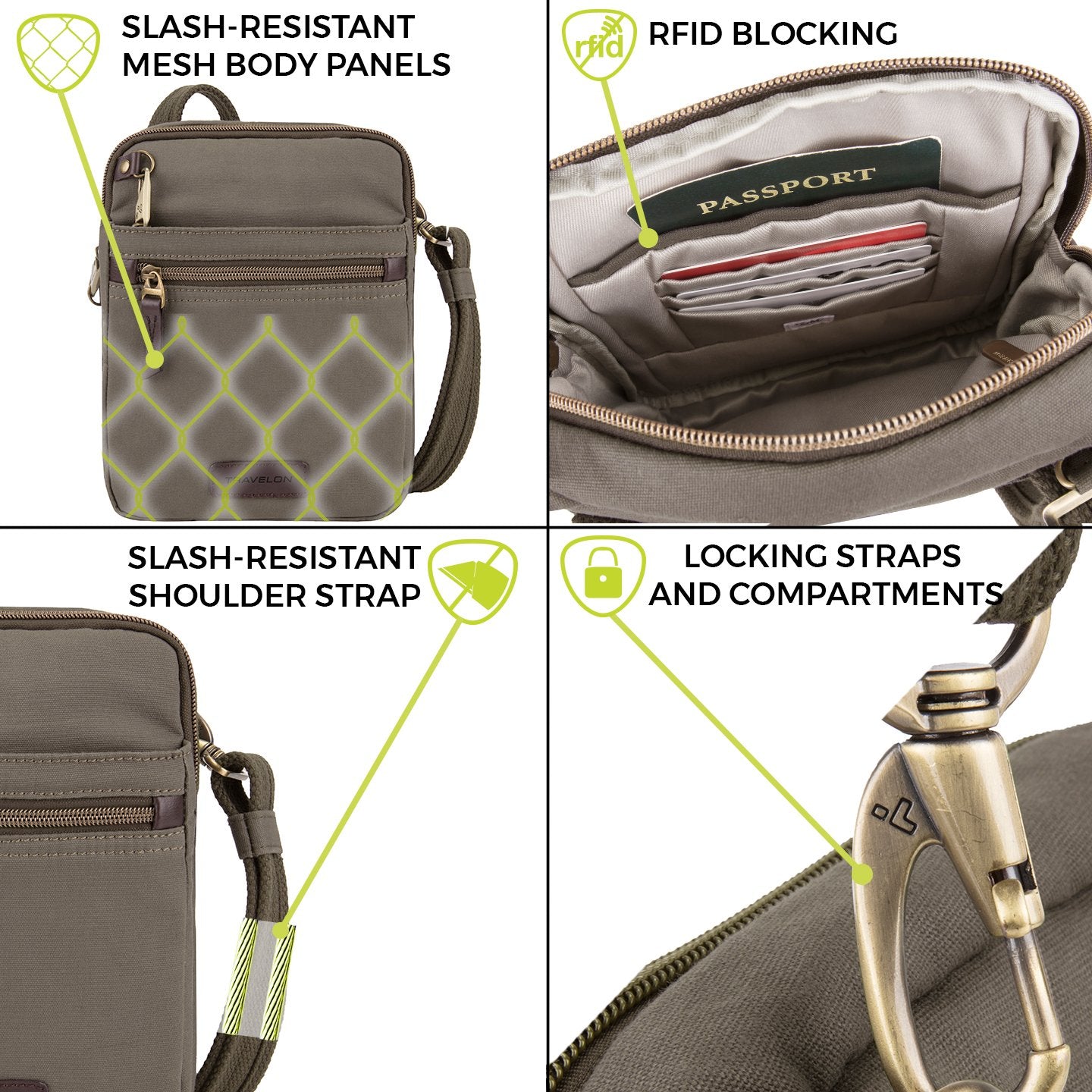 - Full Anti-Theft features include surround slash-resistant body panels and shoulder straps; locking compartments; lockdown strap; and RFID blocking card and passport slots and pockets