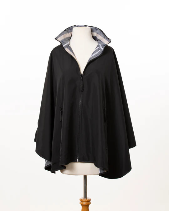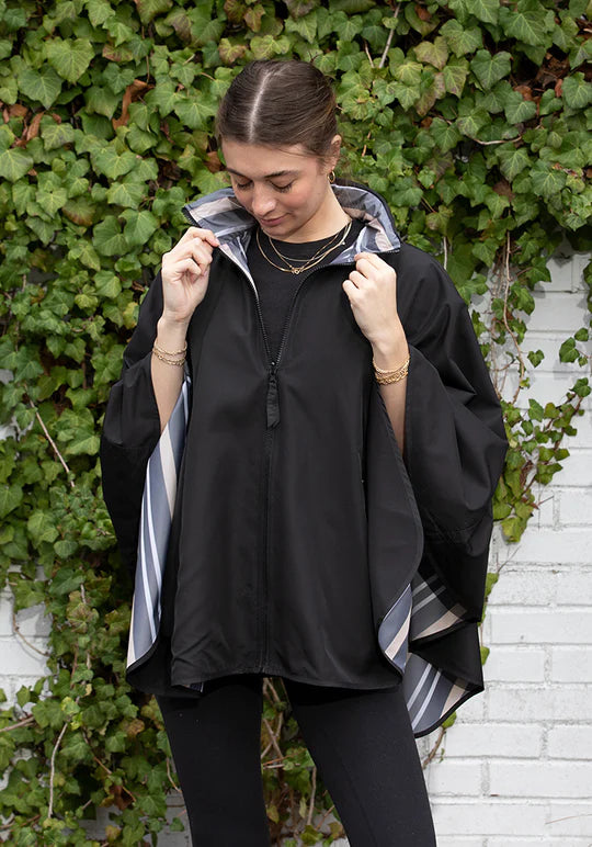 The reversible SPORTYRAP is designed more for the active woman. This new reversible SPORTYRAP has a front zipper (on both sides), one set of zippered pockets (one side) and a hidden hood. The SPORTYRAP is water-repellent, lightweight, fast-drying and easy to store in its matching travel pouch.