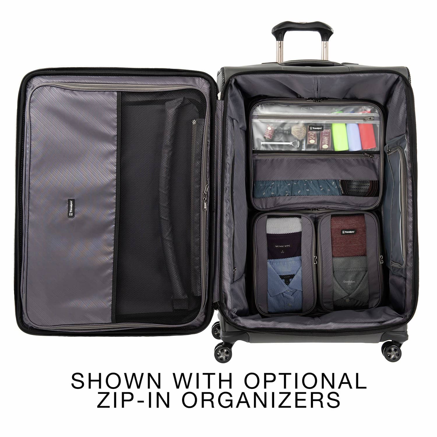 - Fold-out suiter system protects against wrinkles