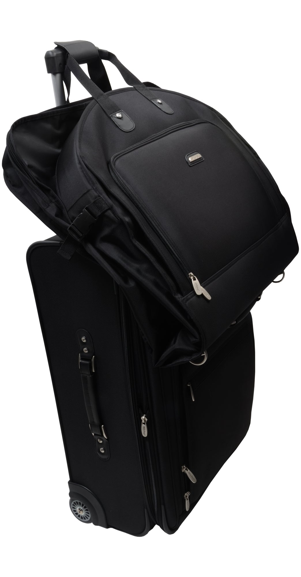 - Removable padded roll bar strap secures garments, and side clips hold bag together when folded