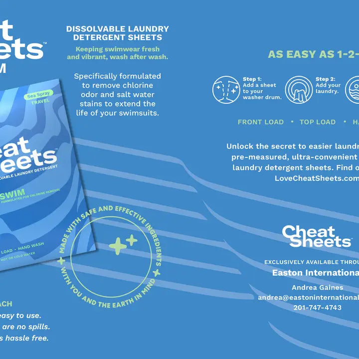 Cheat Sheets is the easiest and most effective way to clean clothing using our targeted formulations for gentle and delicate fabrics; swim wear; and all purpose for everyday clothing. They dissolve completely in hot or cold water, leaving no residue on your clothing/swimwear or in your washing machine or wash basin.
