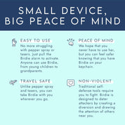 Birdie 3.0 is The Original Personal Safety Alarm made by women, for women. She's as loud as a jet engine overhead. Made for everyday use, bring her everywhere you go for peace of mind.