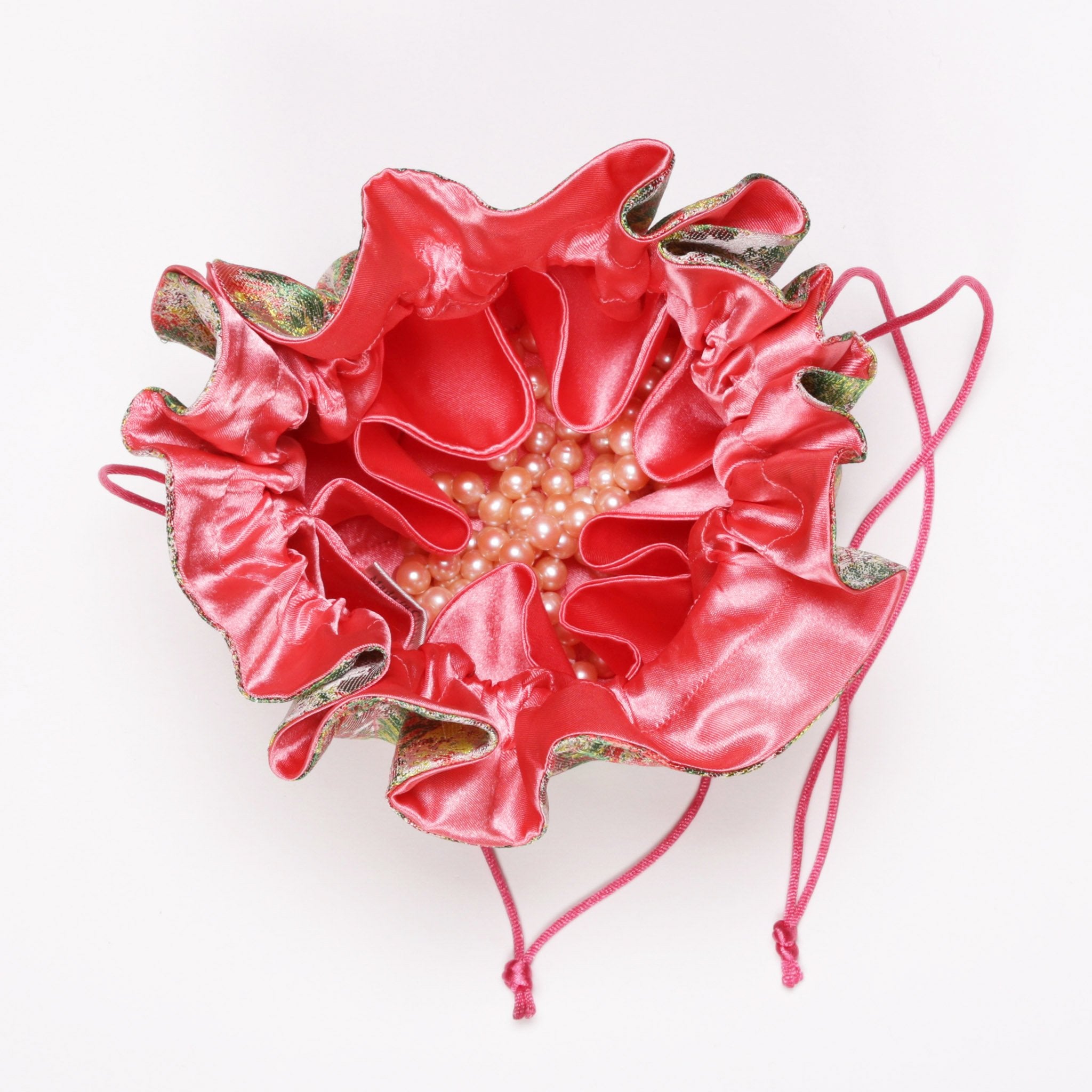 These drawstring jewelry pouches are made of polyester fabrics. The colors of drawstrings, body fabrics, and lining fabrics are coordinated to achieve an optimal visual impact.